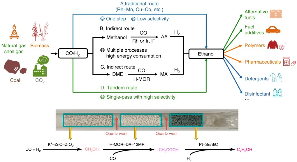 Synthesis of ethanol from syngas (CO/H2) is an attractive but challenging research target. The current transformation of syngas into ethanol suffers from low selectivity (less than 60%) or multiple processes with high energy consumption. In a recent article published in Nature Communications, we report a high-selective conversion of syngas into ethanol by triple tandem catalysis. An efficient trifunctional tandem system composed of K+–ZnO–ZrO2, modified H-MOR zeolite and Pt–Sn/SiC working compatibly in syngas stream in one reactor can afford an ethanol selectivity as high as 90%.
